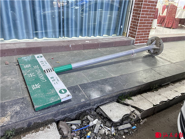 11月28日晚,記者在城區(qū)聯(lián)興街看到,聯(lián)興街的路牌被“連根拔起”放倒在一家飯店前面,上面有被踩踏的泥痕,旁邊臺階也存在損壞現(xiàn)象。路牌成為路障,影響市容市貌,影響市民通行,希望有關(guān)部門盡快予以處理。
