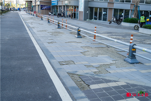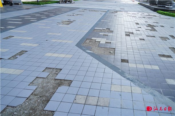 記者在聽海小區(qū)大門口看到,地磚連片破損,形成了大大小小的坑洼,即便是行人走在上面,也會(huì)發(fā)出“松動(dòng)”的聲響。