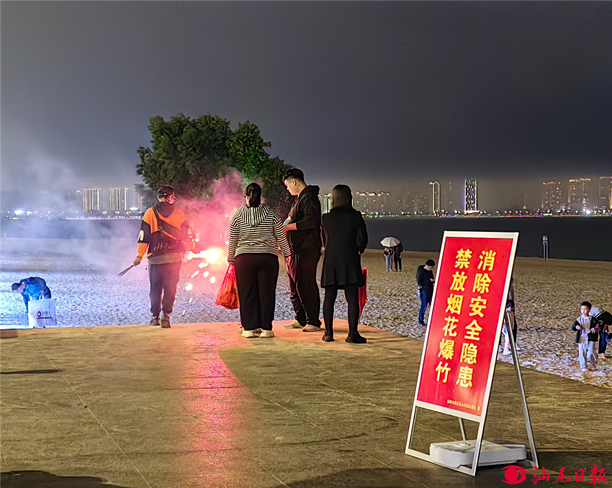 城區(qū)人造沙灘邊樹立有禁放煙花爆竹的警示牌,但仍有個別市民不自覺,對警示內(nèi)容視而不見。
