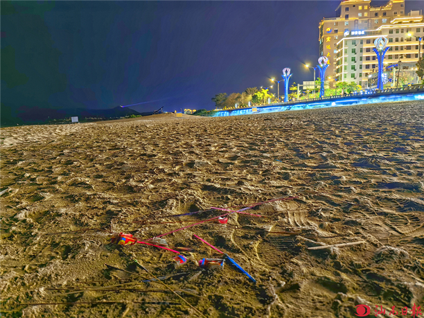 城區(qū)人造沙灘上的煙花殘骸。