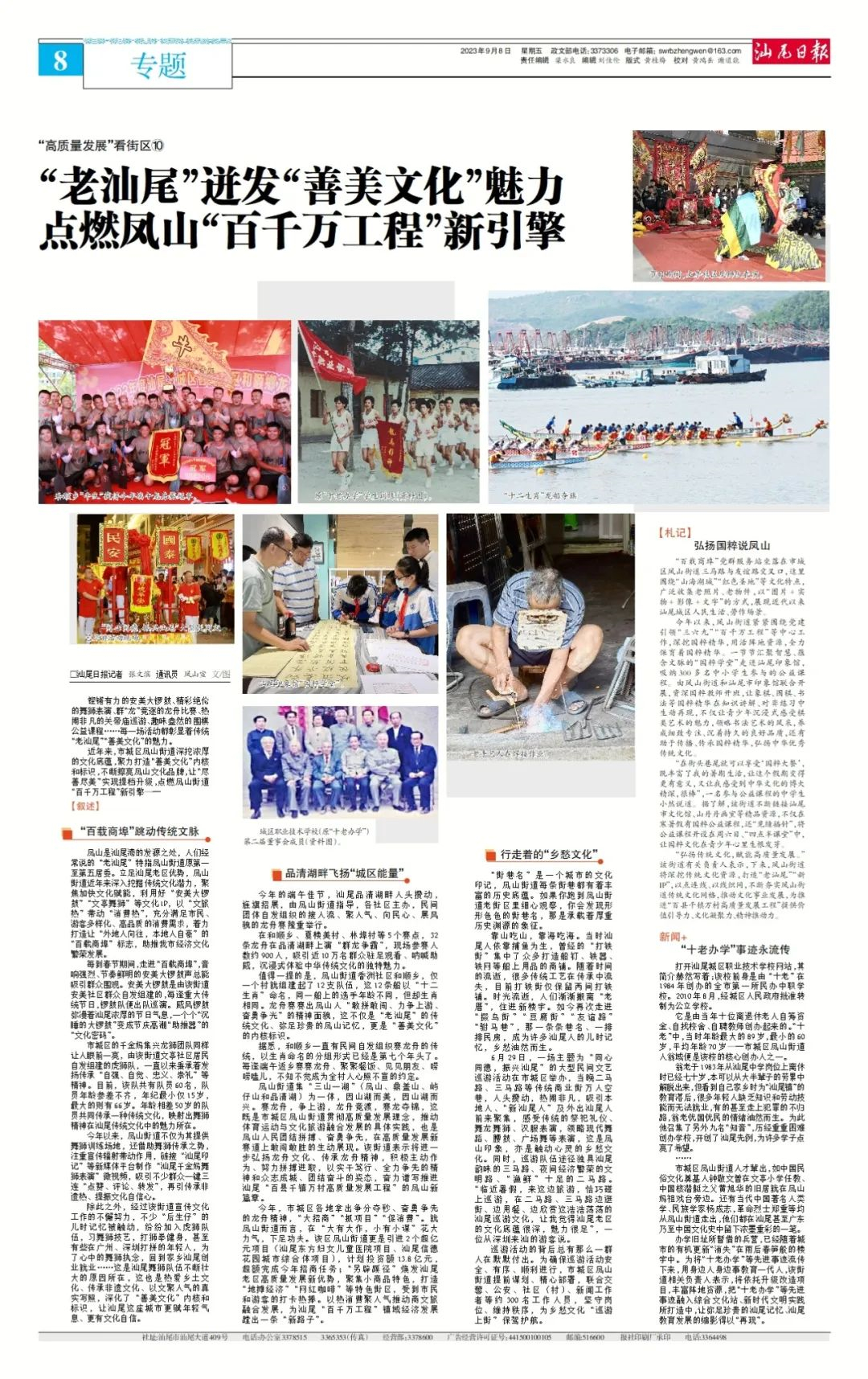 “弘揚傳統(tǒng)文化,賦能高質(zhì)量發(fā)展?!痹摻值烙嘘P(guān)負(fù)責(zé)人表示,下來,鳳山街道將深挖傳統(tǒng)文化資源,打造“老汕尾”“新IP”,以點連線、以線織網(wǎng),不斷夯實鳳山街道傳統(tǒng)文化網(wǎng)格,推動文化事業(yè)發(fā)展,為推進(jìn)“百縣千鎮(zhèn)萬村高質(zhì)量發(fā)展工程”提供價值引導(dǎo)力、文化凝聚力、精神推動力。