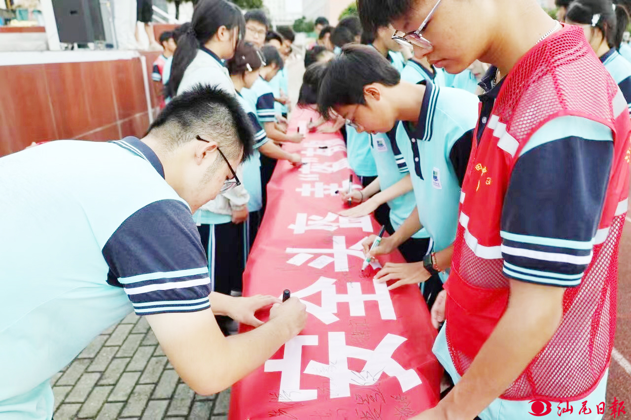 圖為學(xué)生們在交通安全主題橫幅上簽名。