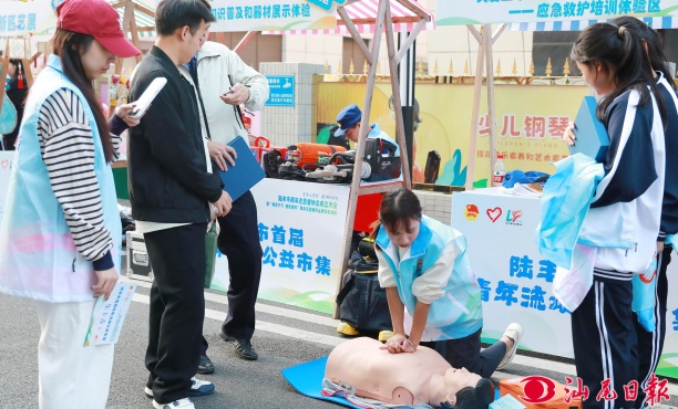 陸豐市首屆青年流動公益市集上,志愿者向群眾講解急救知識。