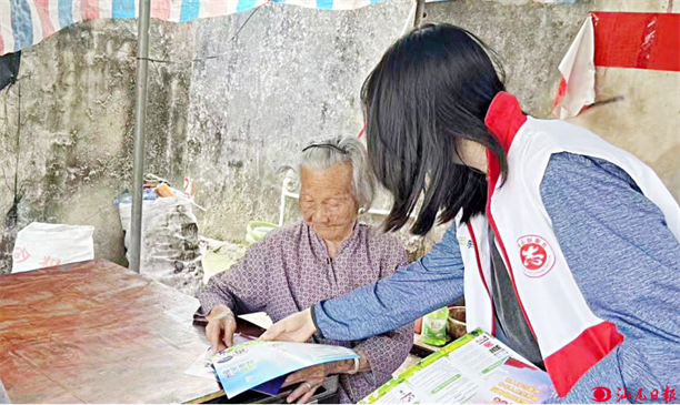 青年干部向群眾發(fā)放《反有組織犯罪法》宣傳手冊,并宣講防詐騙知識。