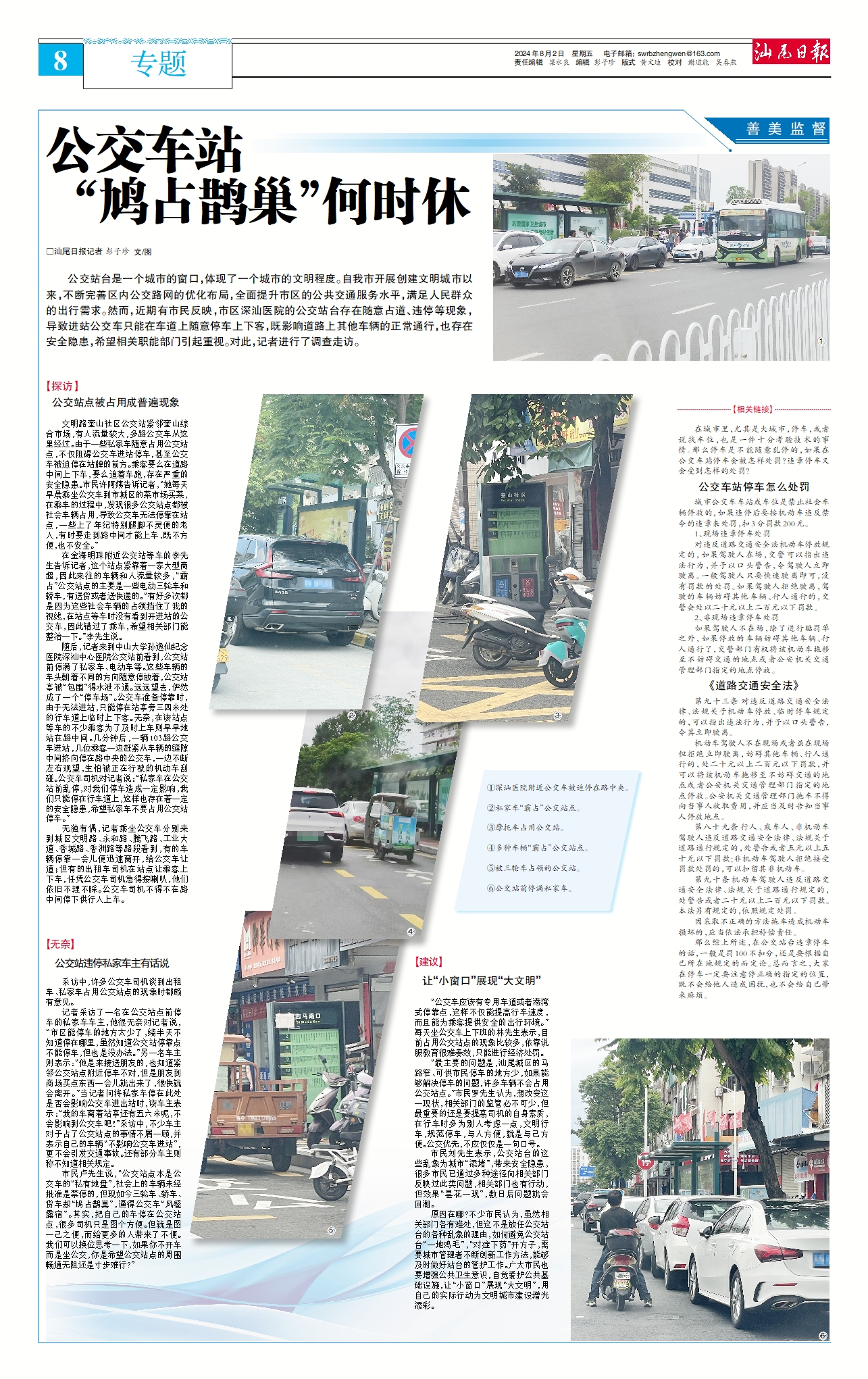 “公交車應(yīng)該有專用車道或者港灣式??奎c(diǎn),這樣不僅能提高行車速度,而且能為乘客提供安全的出行環(huán)境?!泵刻熳卉嚿舷掳嗟牧窒壬硎?,目前占用公交站點(diǎn)的現(xiàn)象比較多,依靠說服教育很難奏效,只能進(jìn)行經(jīng)濟(jì)處罰。“最主要的問題是,汕尾城區(qū)的馬路窄、可供市民停車的地方少,如果能夠解決停車的問題,許多車輛不會占用公交站點(diǎn)?!笔忻窳_先生認(rèn)為,想改變這一現(xiàn)狀,相關(guān)部門的監(jiān)管必不可少,但最重要的還是要提高司機(jī)的自身素質(zhì),在行車時多為別人考慮一點(diǎn),文明行車,規(guī)范停車,與人方便,就是與己方便。公交優(yōu)先,不應(yīng)僅僅是一句口號。市民劉先生表示,公交站臺的這些亂象為城市“添堵”,帶來安全隱患,很多市民已通過多種途徑向相關(guān)部門反映過此類問題,相關(guān)部門也有行動,但效果“曇花一現(xiàn)”,數(shù)日后問題就會回潮。原因在哪?不少市民認(rèn)為,雖然相關(guān)部門各有難處,但這不是放任公交站臺的各種亂象的理由,如何避免公交站臺“一地雞毛”,“對癥下藥”開方子,需要城市管理者不斷創(chuàng)新工作方法,能夠及時做好站臺的管護(hù)工作。廣大市民也要增強(qiáng)公共衛(wèi)生意識,自覺愛護(hù)公共基礎(chǔ)設(shè)施,讓“小窗口”展現(xiàn)“大文明”,用自己的實際行動為文明城市建設(shè)增光添彩。在城市里,尤其是大城市,停車,或者說找車位,也是一件十分考驗技術(shù)的事情。那么停車是不能隨意亂停的,如果在公交車站停車會被怎樣處罰?違章停車又會受到怎樣的處罰?
