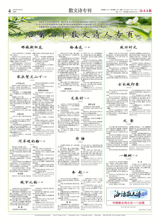 本期重點(diǎn)推出與汕尾散文詩學(xué)會(huì)積極進(jìn)行交流的寧夏石嘴山市散文詩人的作品,以饗讀者。