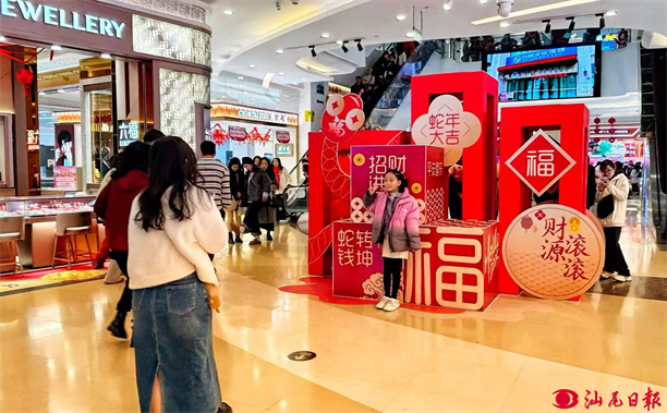 ▲商場(chǎng)內(nèi)充滿蛇年元素的裝飾品,年味氛圍感滿滿的新春“打卡點(diǎn)”,吸引了不少市民游客合影留念。
