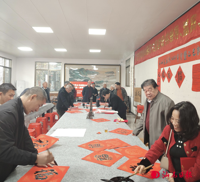 131日(大年初三),市華山書畫院的書法家揮毫潑墨寫“?!弊郑浴凹!钡男问綒g度新春佳節(jié)。