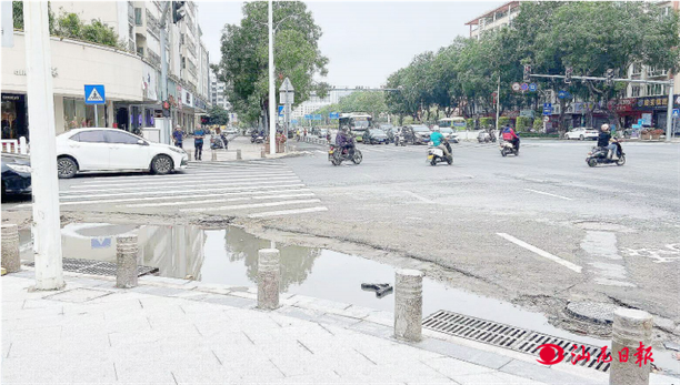 昨日,記者在市區(qū)公園路看到,有一大塊凹陷地帶,雨水囤積,路人紛紛繞坑行走。據(jù)了解,該地段施工圍欄拆卸后,人行道出現(xiàn)了部分凹陷,導(dǎo)致雨后積水。希望有關(guān)部門加強(qiáng)市政設(shè)施監(jiān)管力度,還原道路平坦“面目”。